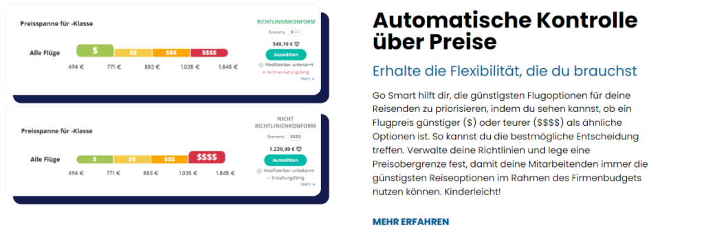 Wenn du eine Geschäftsreiseplattform wie GetGoing nutzt, arbeitet künstliche Intelligenz im Hintergrund, um die besten Reiseangebote und Preise für dich zusammenzustellen, ohne dass du etwas davon merkst. Auf diese Weise kannst du besser einschätzen, welche Tarife für dich geeignet sind, und wenn du in deiner Reiserichtlinie eine Preisobergrenze festlegst, kannst du sicherstellen, dass deine Mitarbeitenden über die nötigen Mittel verfügen, um die richtigen Preisentscheidungen zu treffen. Die GoSmart-Funktion von GetGoing basiert auf KI, um dir bei der Auswahl der besten Flugoptionen auf der Grundlage von Preisdaten zu helfen.